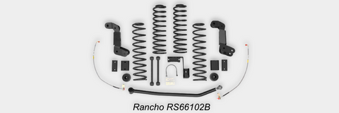 Rancho RS66102B 4-In. Sport System – Designed for both two-door and four-door models, this kit fits up to 37-in. tires and gives 4-in. of additional ground clearance needed for rock crawling or trail riding. Features a geometry correction bracket, adjustable front track bar and front and rear progressive rate coil springs specifically tuned to deliver superior on-road comfort and off-road performance. Add Rancho shocks to complete your upgrade.