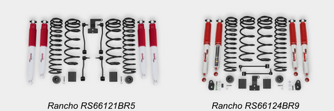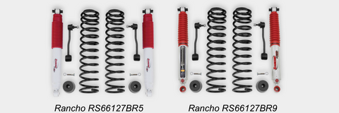 Rancho 2-in. to 3.5-In. Sport Suspension System Fits up to 35-in. tires and provides 2-in. to 3.5-in. of additional ground clearance needed for trail riding or on-road driving. For four-door models, choose RS66124BR5 for system with front and rear RS5000®X shocks or select RS66124BR9 for system with front and rear RS9000®XL shocks. For two-door models, choose RS66121BR5 for system with front and rear RS5000X shocks or select RS66121BR9 for system with front and rear RS9000XL shocks.