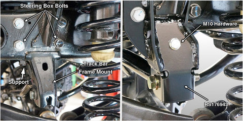 - Install the OE M14 bolt through the newly installed Rancho track bar support bracket. Install the four steering box bolts loosely.