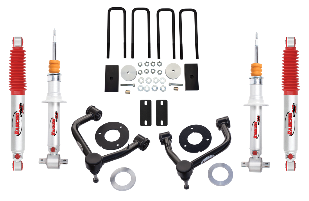 Includes Rancho RS9000XL struts and rear shocks, upper control arms with ball joints, rear block kit, sway bar spacers and mounting hardware